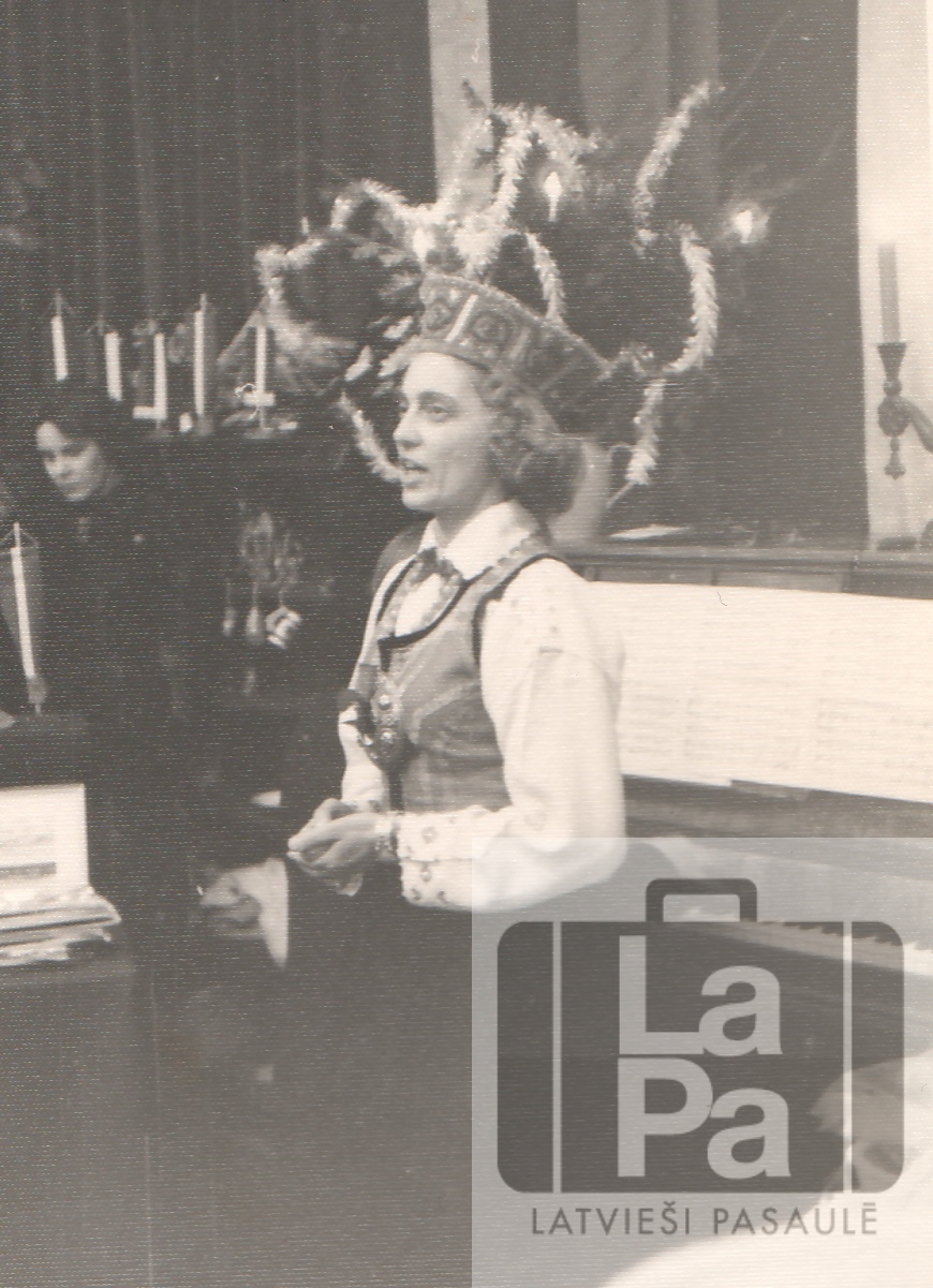 Zigrīda Daškevica Bārtas tautas tērpā uzstājas Ziemassvētku pasākumā Anglijā.