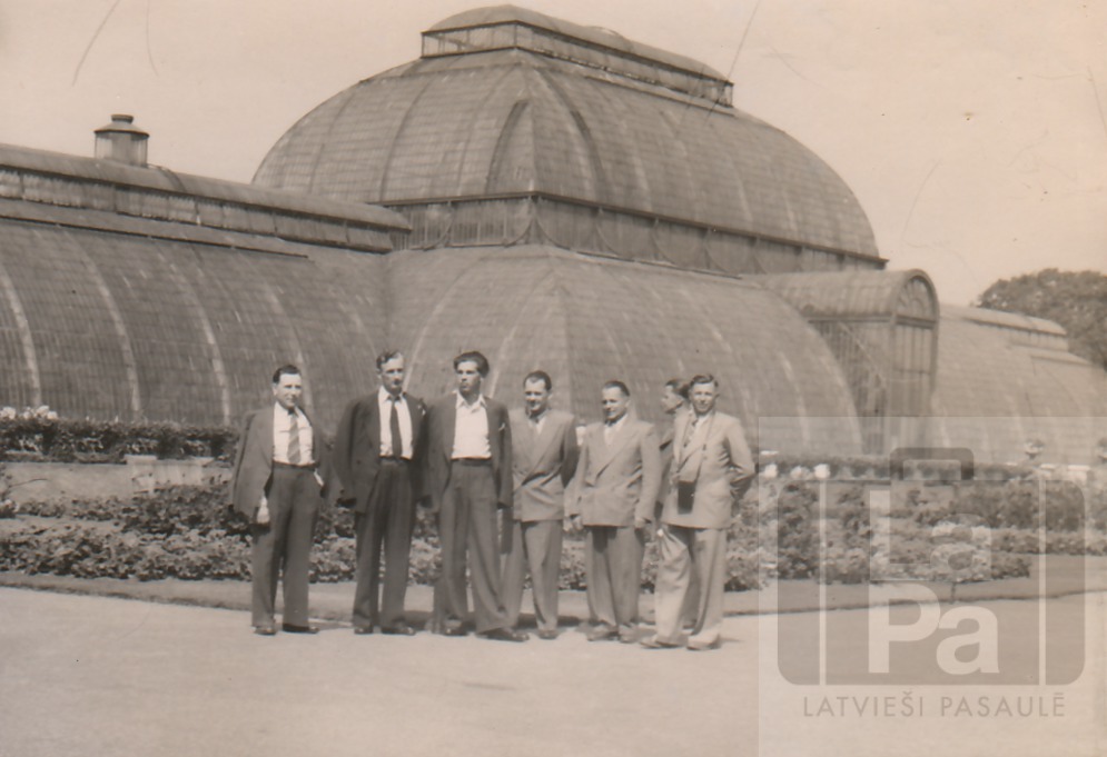 Latvieši Anglijā, Londonā Kjū dārzs (Kew Gardens), 20.gadsimta 50.gadi. Bēgļi izbraukumā svētdienā. No kreisās: Stupavs, Podziņš, Jānis Daugulis.