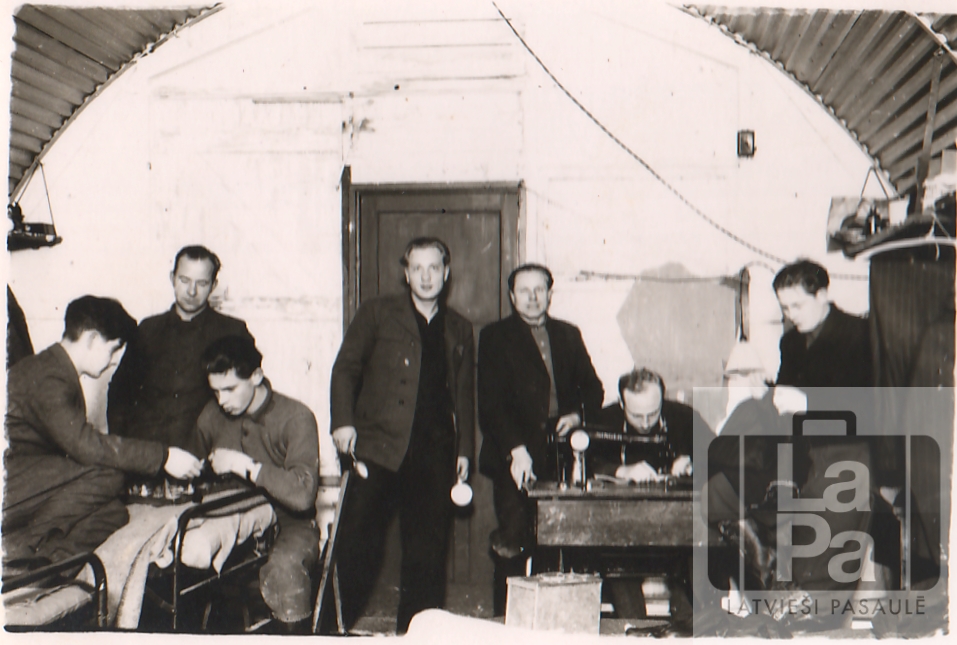 Baraka Anglijā 20. gadsimta 50. gadu sākumā Čičesterā (Chichester). Centrā sēž skroderis Tilaks, kreisajā pusē (2. sēž) Jānis Daugulis spēlē šahu.