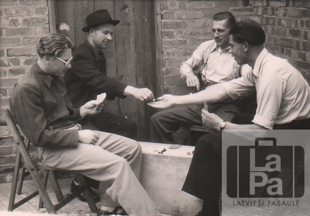 Jānis Daugulis (pirmais no labās) spēlē kārtis uz naudu. Anglija, 20. gadsimta 50. gadi.