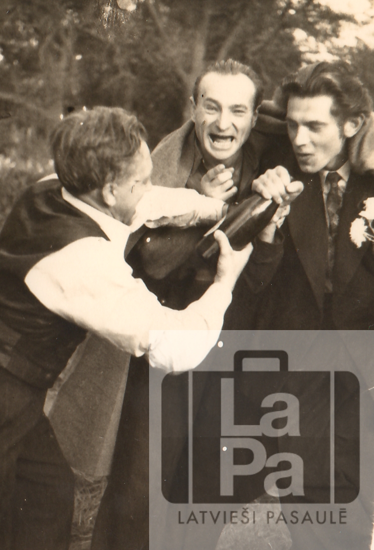 Jānis Daugulis latviešu ballītē 20. gadsimta 50. gados Anglijā. No kreisās: nezināms, vārds nezināms Kalējs, Jānis Daugulis.