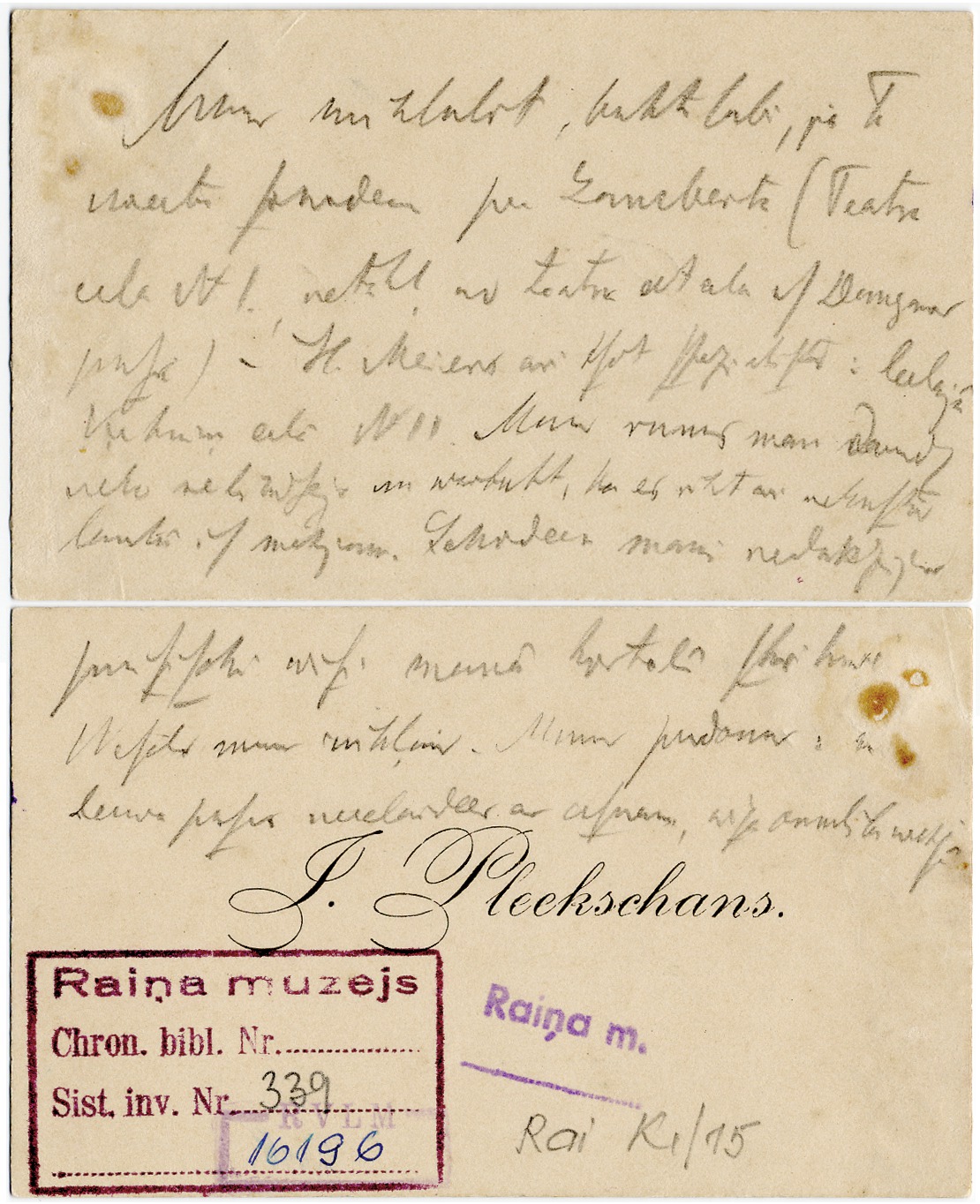 Zīmīte. Rainis - Aspazijai. Rīga, 1895.gada pavasaris. 2 lpp. rokr. ar zīmuli, uz J.Pliekšāna vizītkartes. Papīrs dzeltējis.