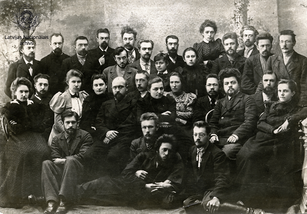 Politiski izsūtīto grupa Slobodskā. Augšējā rindā no kreisās: 2. Rainis, 5. Pēteris Stučka. Slobodska, Vjatkas guberņa.