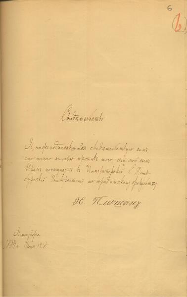 Krišjāņa Pliekšāna rakstisks apliecinājums, ka viņš neiebilst pret sava dēla studijām Pēterburgas universitātē.