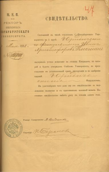 Pēterburgas Universitātes rektora apliecinājums, ka Jānis Pliekšāns izturējis mutisko eksāmenu Juridiskajā fakultātē. Pēterburga, 1888. gada 31. maijā