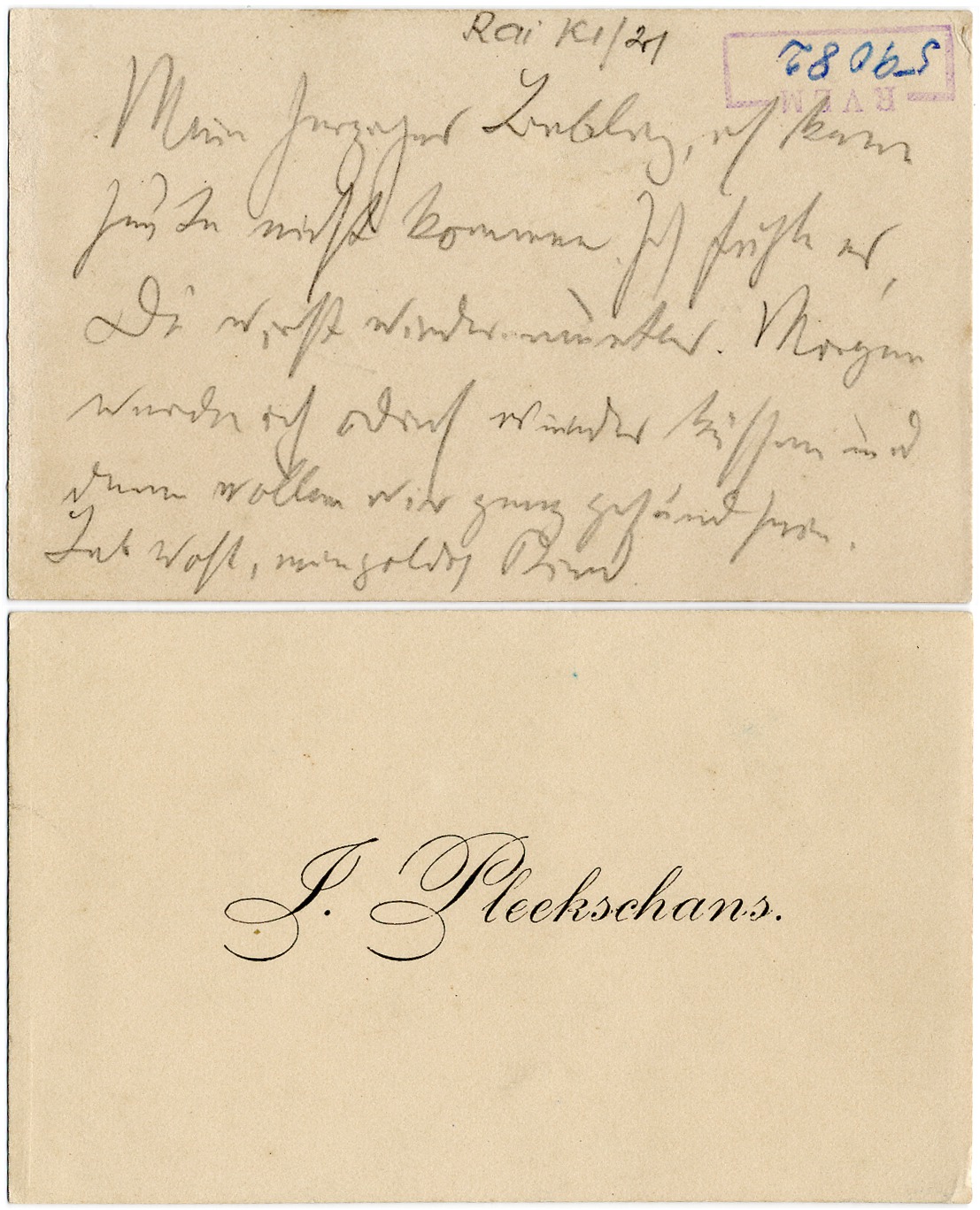 Zīmīte. Rainis - Aspazijai. Rīga vai Jelgava, 1894.gada maija 2.puse - 1896. gada novembra sākums. 1 lpp. vācu valodā, rokr. ar zīmuli, uz savas vizītkartes. Papīrs dzeltējis.