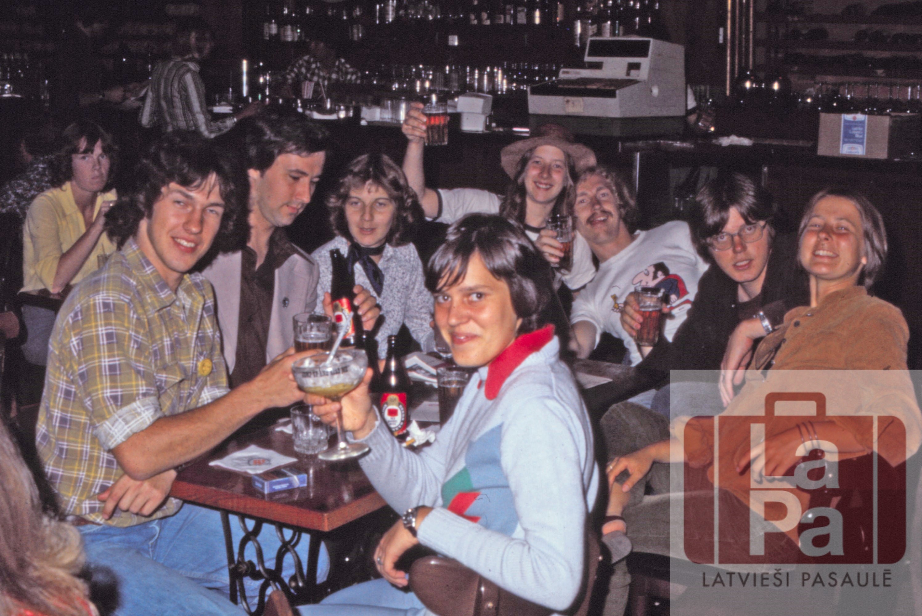 Monreālas jaunieši vakariņo restorānā The Old Spaghetti Factory 6. Latviešu Dziesmu svētku un Latviešu dienu Kanādā ietvaros. No kreisās: Roberts Klaiše, Pēteris Miķelsons, Irēne Niedra, Inese Godiņa, nezināma, Andrejs Vītols, Jānis Mateus, Baiba Audere.