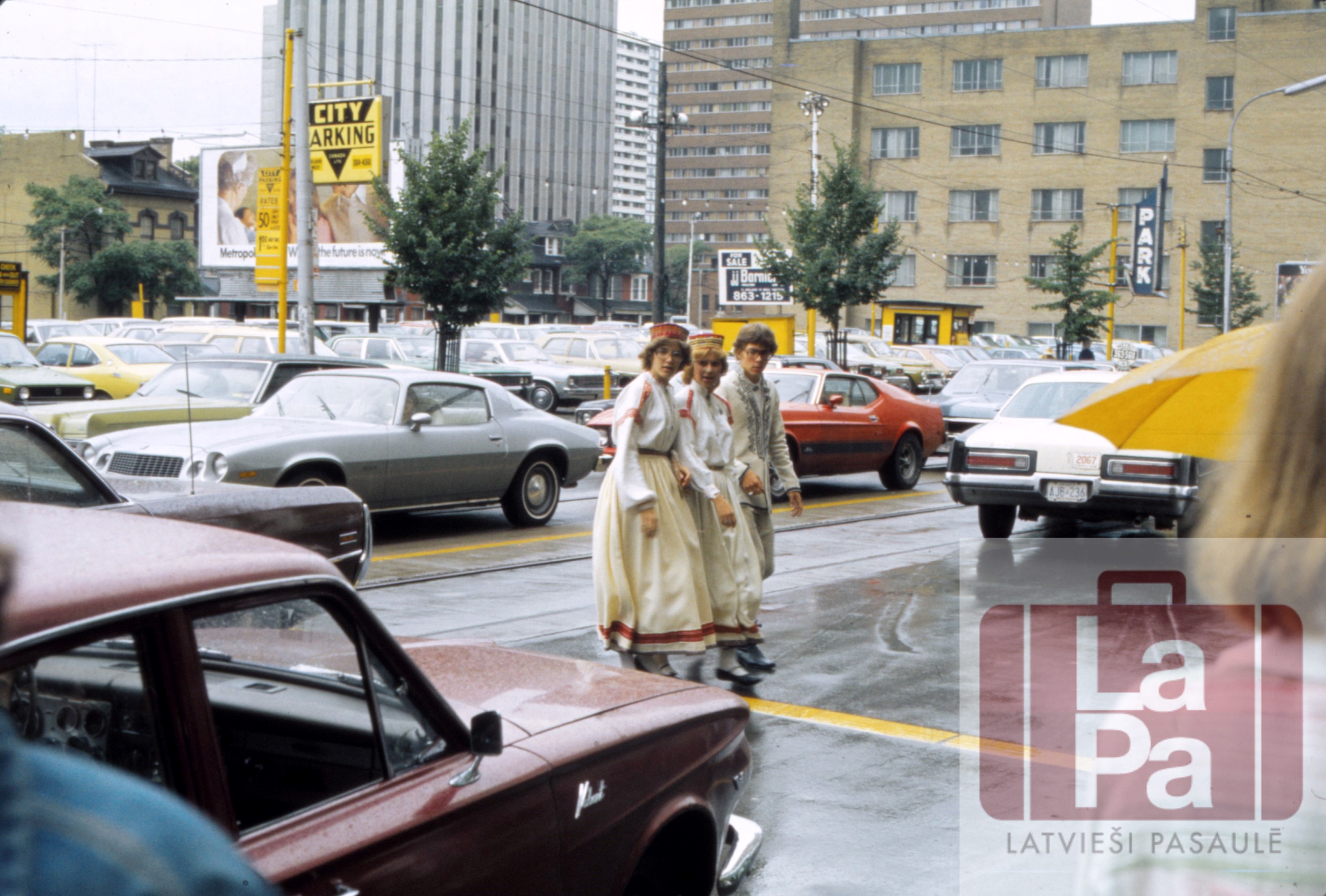 Tautas deju ansambļa dalībnieki šķērso ielu pie Maple Leaf Gardens ledus arēnas Toronto brīdi pirms Tautas deju lieluzveduma 6. Latviešu Dziesmu svētkos un latviešu dienās Kanādā 1976. gadā.