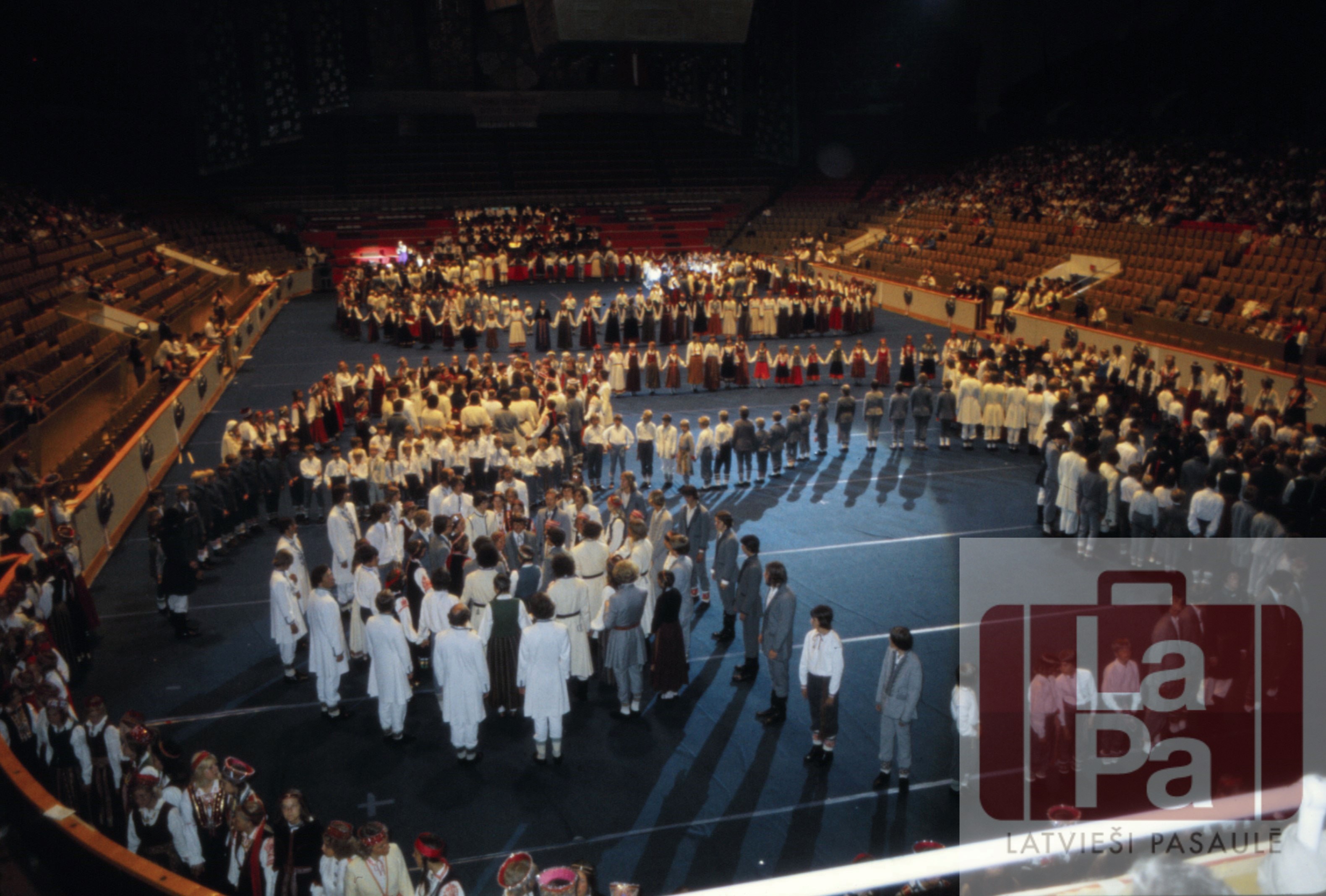 Tautas deju lieluzvedums Maple Leaf Gardens ledus arēnā Toronto. 6. Latviešu dziesmu svētki un Latviešu dienas Kanādā, 1976. gads.