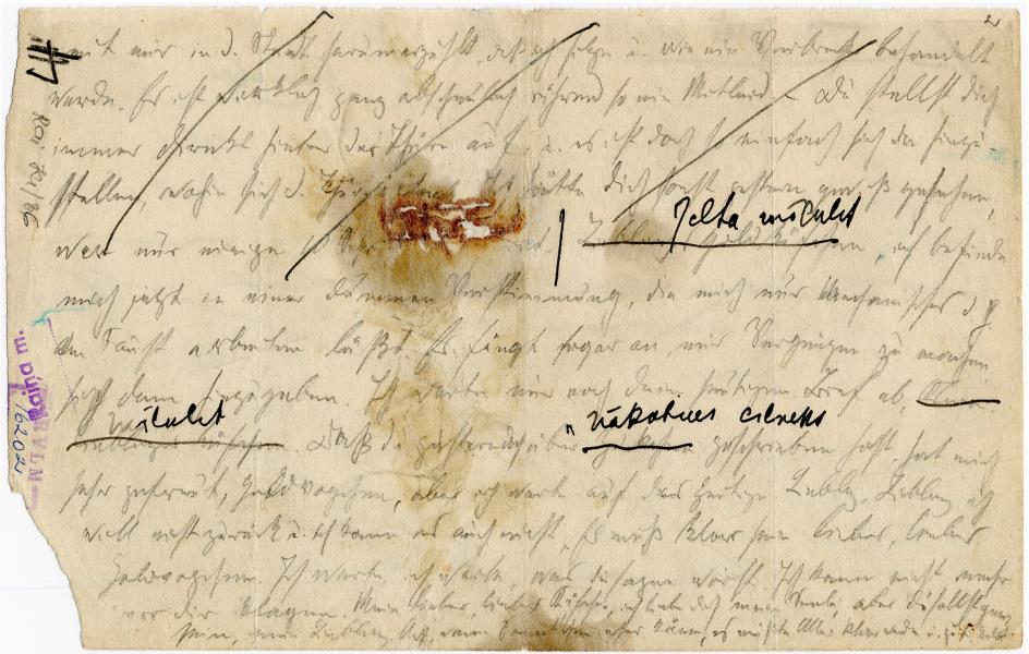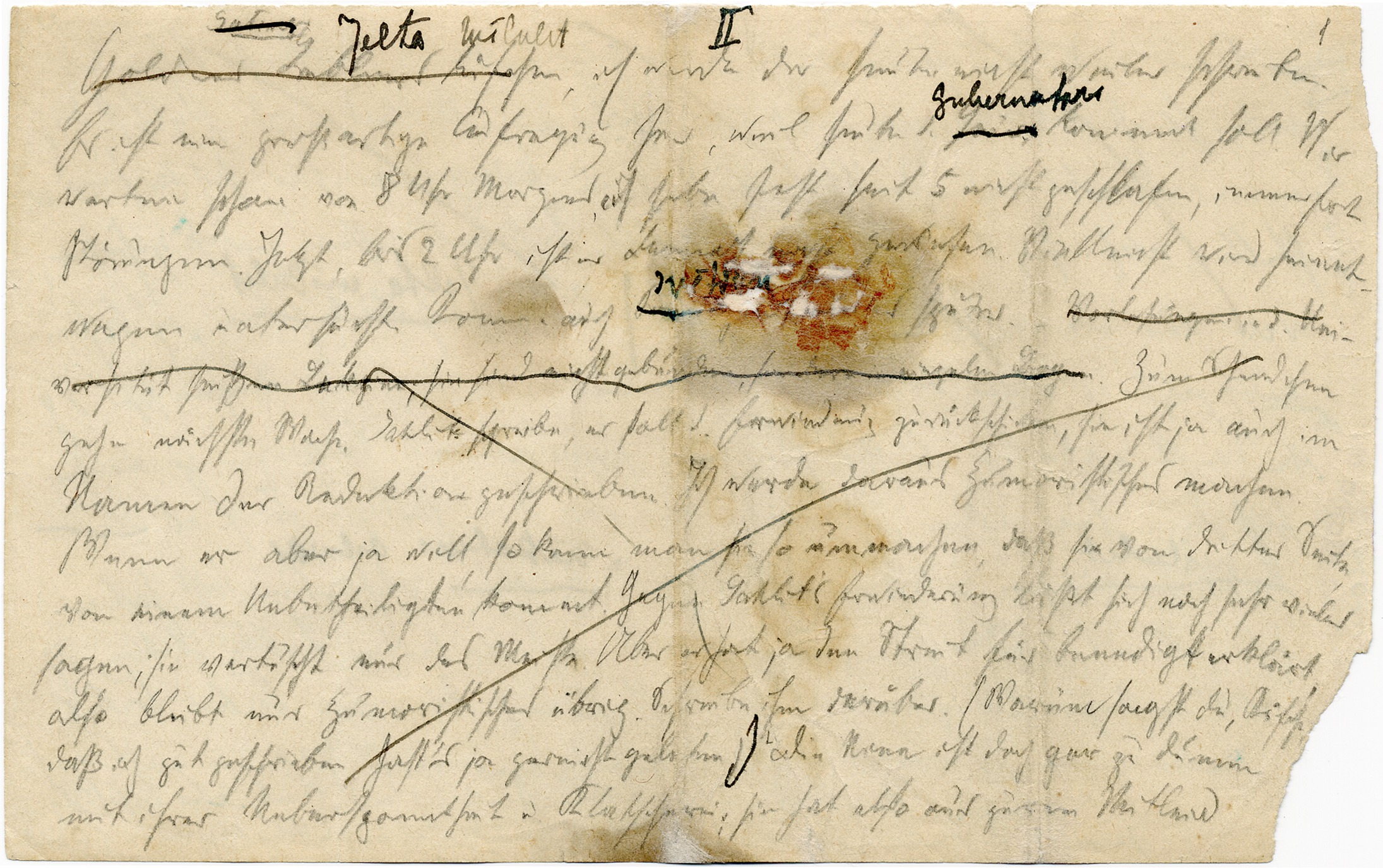 Vēstule. Rainis - Aspazijai. Panevēžas cietums, 1897.gada 14. jūnijs. 2 lpp. vācu valodā, rokr. ar zīmuli. Vēlākie svītrojumi un labojumi ar melnu tinti Aspazijas rokrakstā. Papīrs dzeltējis.