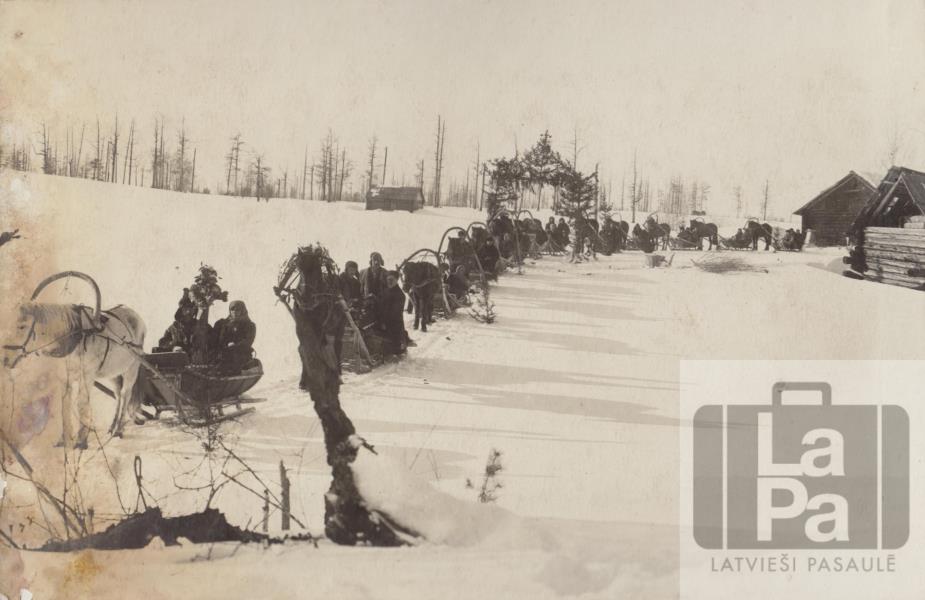 Bērinieku brauciens Sibīrijā, Krasnojarskas novadā. Fonā guļbūves ēkas un mežs.