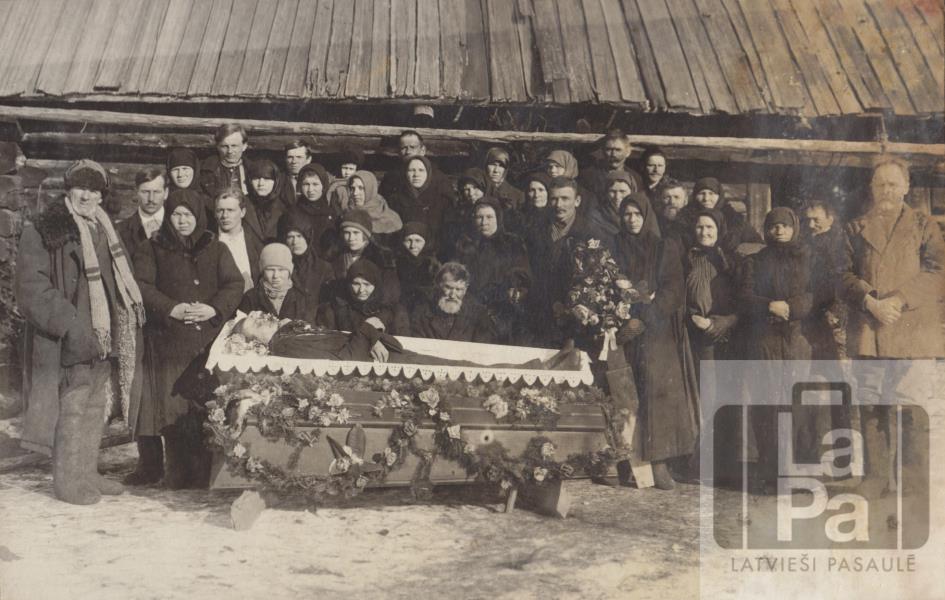 Bērinieki pie nelaiķa zārka Sibīrijā. Fonā guļbūves ēka.