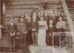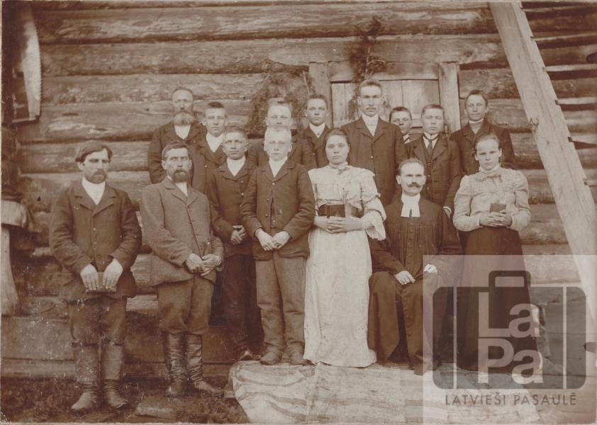 Cilvēku grupa ar luterāņu mācītāju pie skujkoku zariem rotātas guļbūves. Mācītājam abās pusēs iesvētāmās meitenes. Sibīrija. Fotogrāfija uzņemta pirms I Pasaules kara.