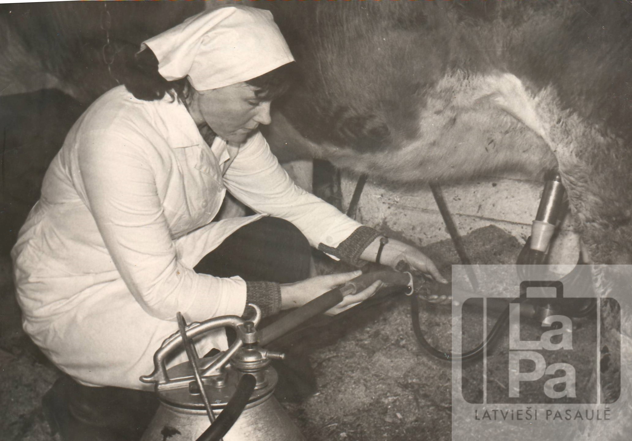 Lejas Bulānas latviete Valentīna Būda pie slaucamā aparāta mācību prakses laikā Hakasijā 1981. gadā.