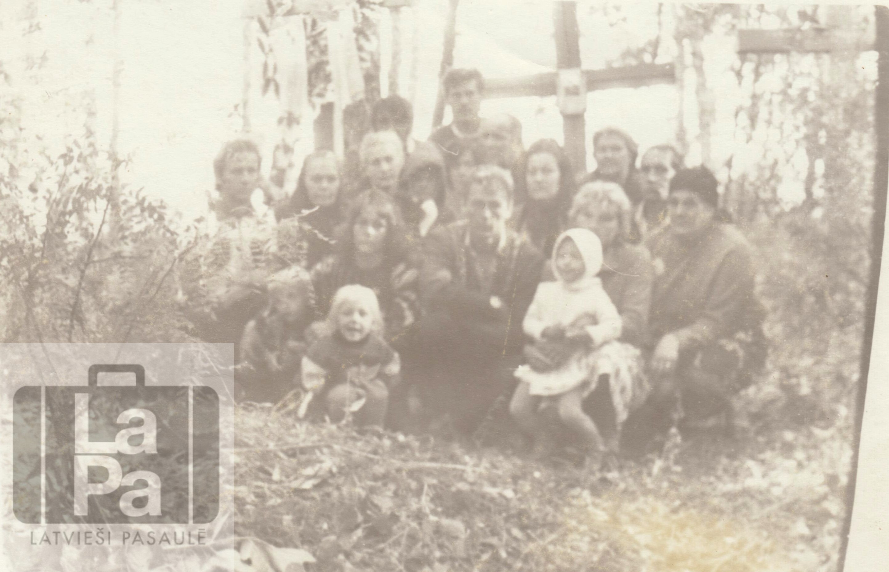 Ģimene Timofejevkas kapsētā. Vasarsvētki 20. gadsimta 80. gados. Kreisajā pusē priekšā Ņina Ivule ar 2 maziem bērniem.