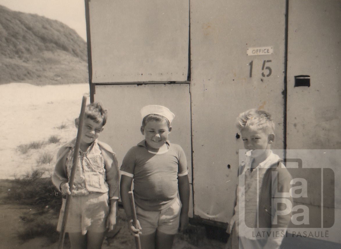 Brisbenas Māras draudzes latviešu skolas nometne Tallebudgera pludmalē. No kreisās: Jānis Skadiņš, Andris Kūla, nezināms. Ap 1958. gadu.