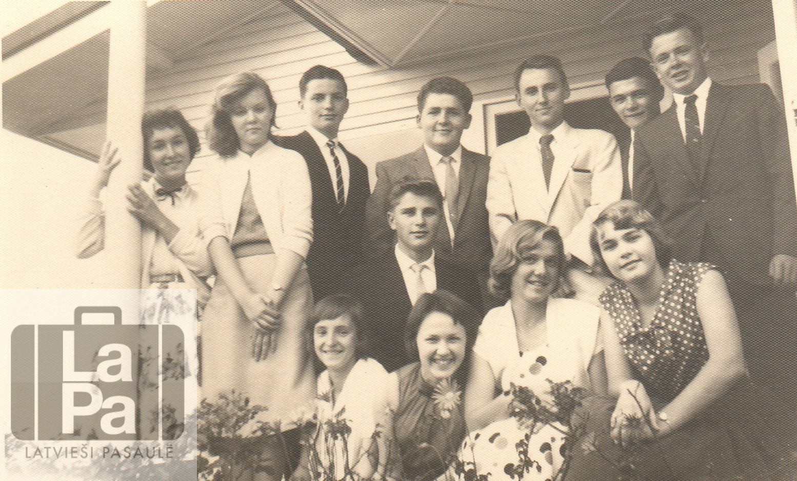 Latviešu jaunieši Rudzīšu mājā Brisbenā Arņa Kūlas 21. dzimšanas dienā. No kreisās 1. rindā: Dzintra B., Lāse Gaišums, Dzintra Zolte, nezināma; 2. rindā: Valters Zolte; 3. rindā: Dace Blūms, Helga Ozoliņa, nezināms, Arnis Kūla, Ģirts Ozols, Andris Vēvers.
