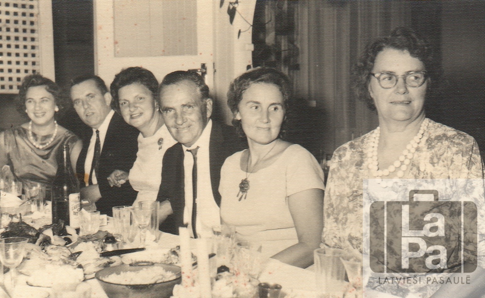 Latviešu viesības Brisbenā, Austrālijā, 1955. gadā. No kreisās: Adele Okšis, Jānis Kūkums, Irēna Kūkuma, Jānis Kūla, Lilija Kūla, Reimers kundze.