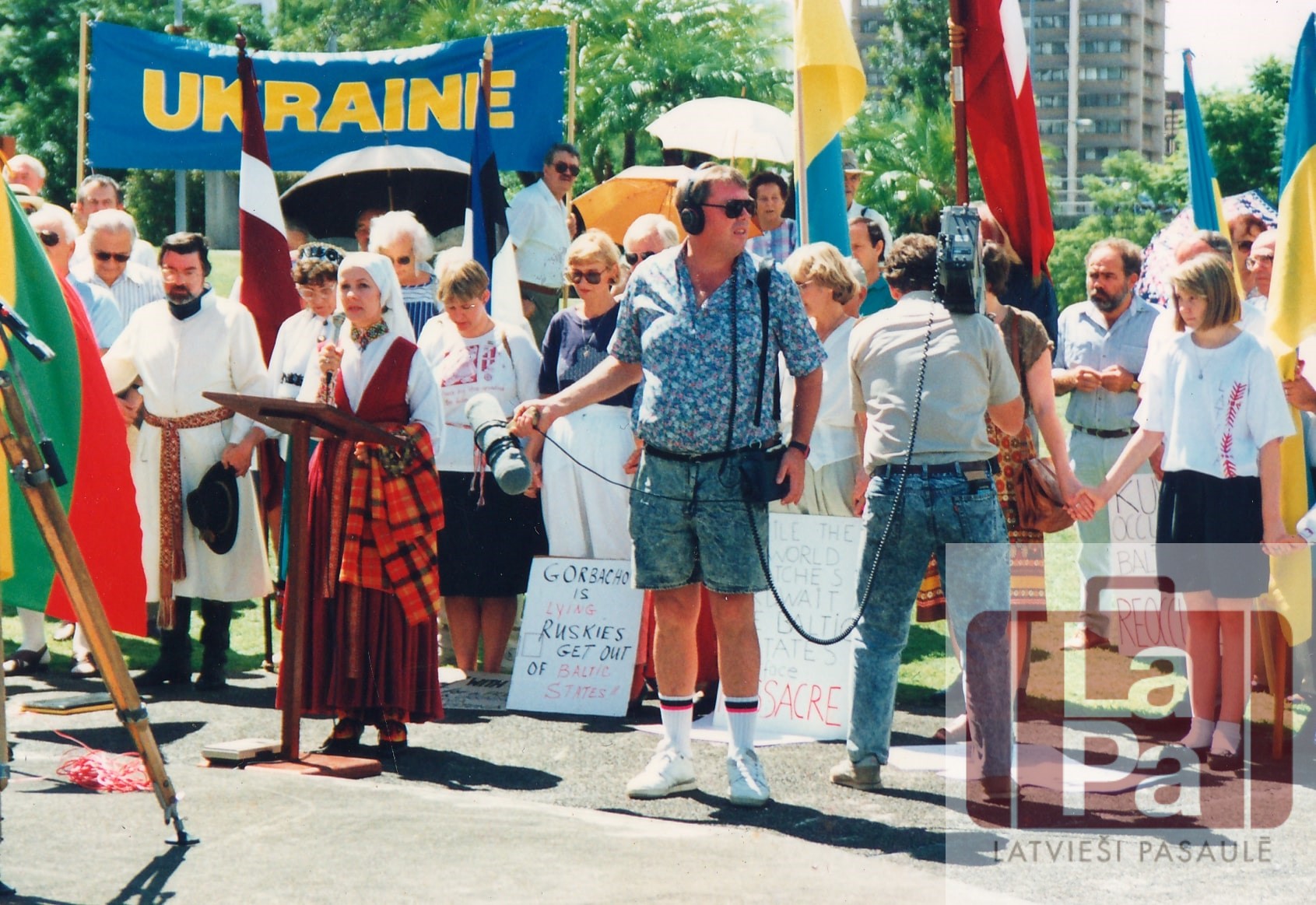 1991. gada janvārī Brisbenas pilsētas centrā Māra Siksna runā demonstrācijā par Baltijas valstu neatkarību. Filmē un ieskaņo valsts televīzija "ABC".