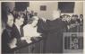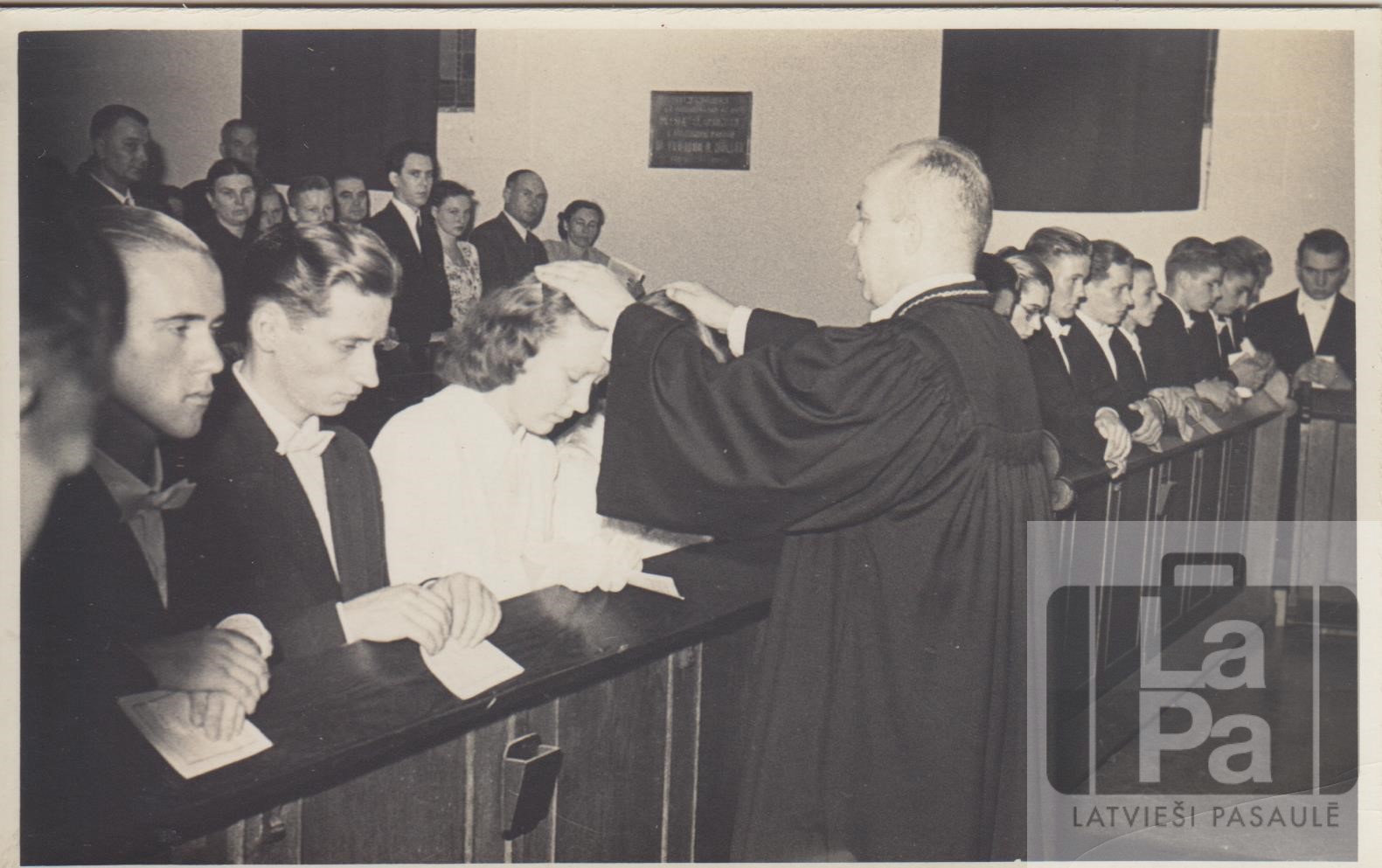 Pirmās latviešu jauniešu iesvētības Argentīnā, Ev. Lut. Pestītāja baznīcā (Villa del Parque, Buenosairesā), 1952. gada 16. martā. Mācītājs Arnolds Liepiņš dod svētību. No kreisās: Juris Rudolfs, Gunārs Sausiņš, Gaida Vilmanis. Aiz mācītāja: nezināms, Valentīns Vilmanis, Ivars Sausiņš, nezināms, nezināms, Sergejs Grants un citi.