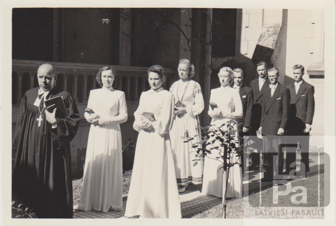 Iesvētības Ev. Lut. Pestītāja baznīcā (Villa del Parque, Buenosairesā), 1953. gada 15. martā. Mācītājs Arnolds Liepiņš gājienā ar iesvētāmiem pagalmā. Aiz mācītāja, no kreisās: Laima Dzalba, Ilona Mūrniece, Ita Vilmanis, Valda Bandere, Juris Stucis, Ilmārs Vilmanis, Alvis Zuntaks, Alis Vilmanis.