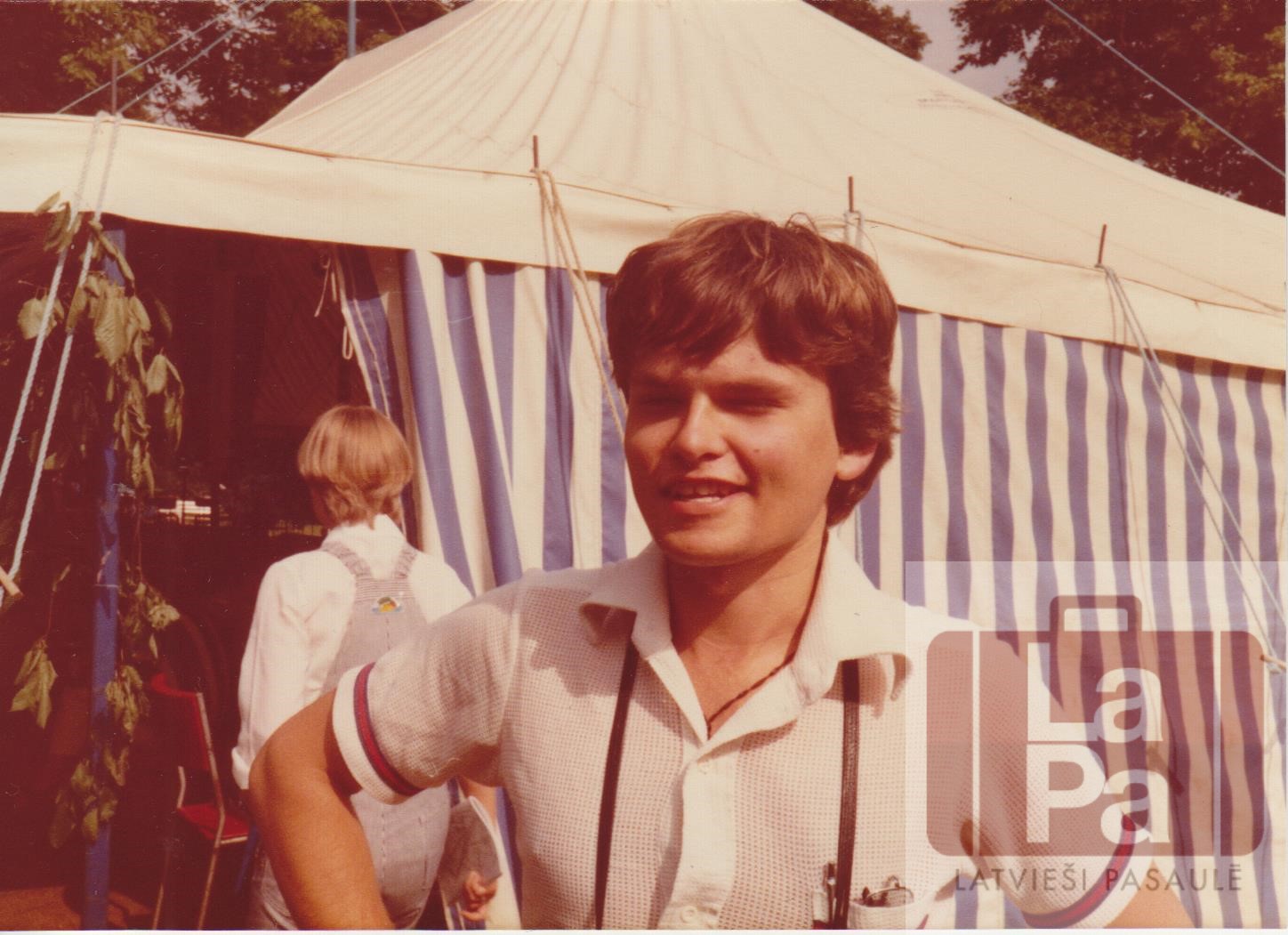 Pēteris Dārziņš V Vispasaules latviešu jaunatnes kongresā Anglijā, Straumēnos. Fotogrāfijas otrā pusē rokrakstā: STRAUMĒNI – V VLJK – 8/81 PĒTERIS DĀRZIŅŠ (AUSTRĀLIJA).
