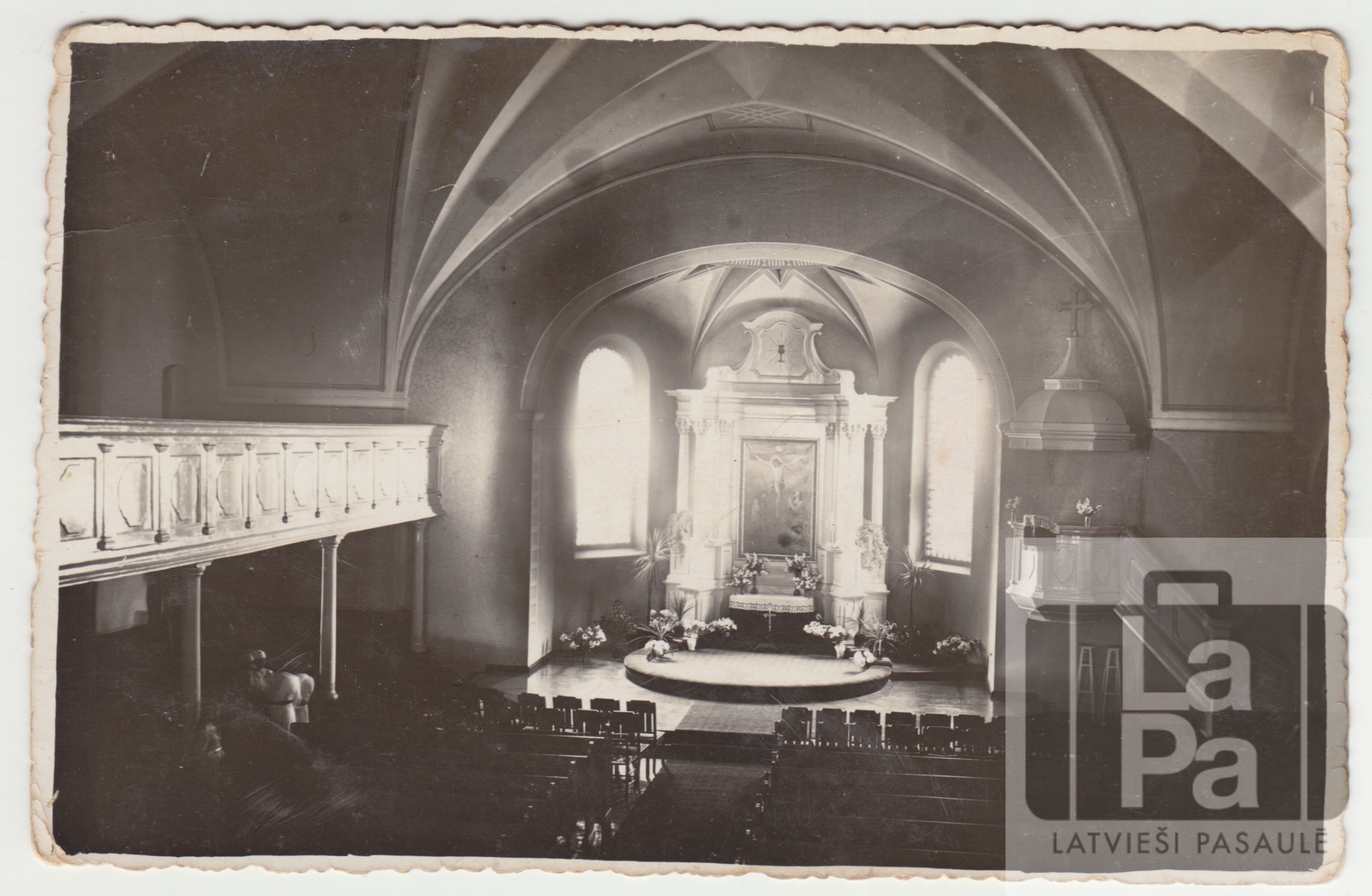 Raunas baznīcas iekšskats. Šajā baznīcā 1937. gadā laulāti Elza un Augusts Rāceņi. Fotogrāfija ņemta līdzi, dodoties bēgļu gaitās.