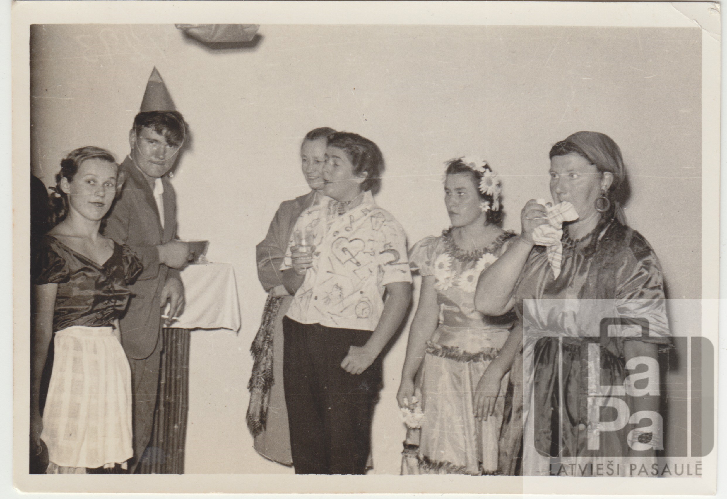 Karnevāla balle Grantu mājās. Vizbulīte Lēnspēlnieks, (vārds nezināms) Vilmanis, Alma Vilmanis, Benita Jansons, Dzintra Rācenis, Ņina Murza. Iespējams, Sanmigelas pilsētā Argentīnā. 1957. gada 3. marts.