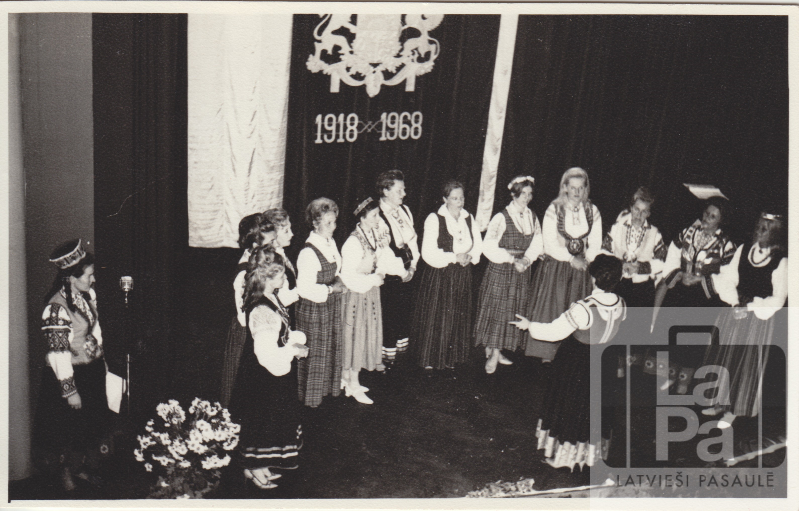 Argentīnas sieviešu (latviešu) koris tautas tērpos 1968. gada 23. novembrī uz Argentīnas Latviešu Augšāmcelšanās draudzes nama skatuves Urlingamā (Hurlingham) ar diriģenti Elvīru Liepiņu. Latvijas neatkarības 50. gadadienas atzīmēšana. Kreisā pusē pie mikrofona stāv Dzintra Rācene. Starp kora dalībniecēm Ilona Blūzmane, Jūlija Blūzmane, Ņina Murza, Erika Saulesleja, Irēne Murza, Mudīte Stanga, Jūlija Brencītis.