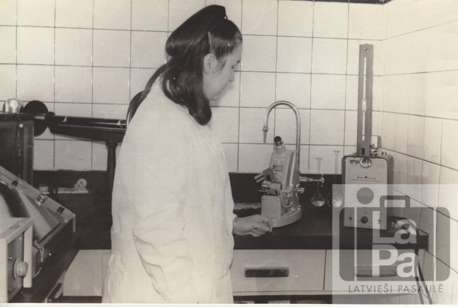 Argentīnas latviete farmaceite Dzintra Rācene darbā SEARLES ķīmiskās rūpnīcas produktu pārbaudes laboratorijā. Buenosairesa, 1975. gads.