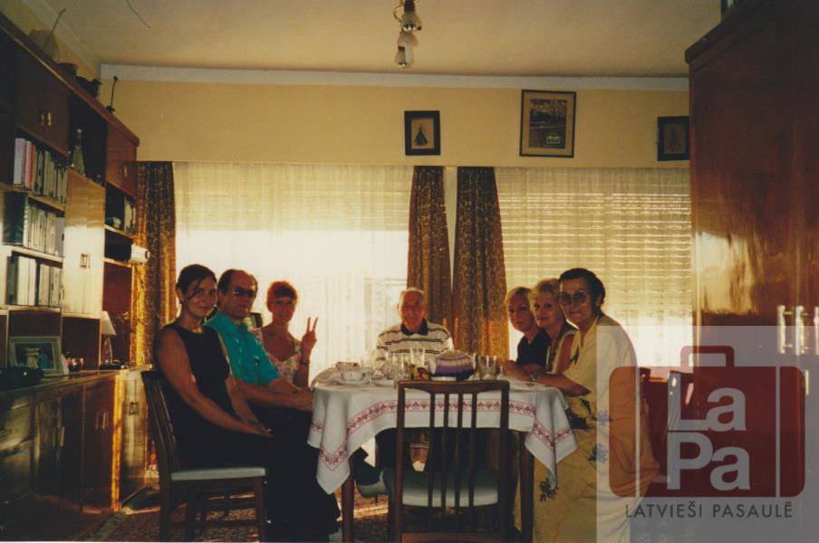 Latvijas Radio darbinieku viesošanās Argentīnas latviešu Rāceņu mājās. No kreisās: Lidija Veronika Moreno, žurnālists Imants Rākins, žurnāliste Dārija Juškeviča, Augusts Rācenis, žurnāliste Ingrīda Stroda, Irēne Murza, Dzintra Rācene.