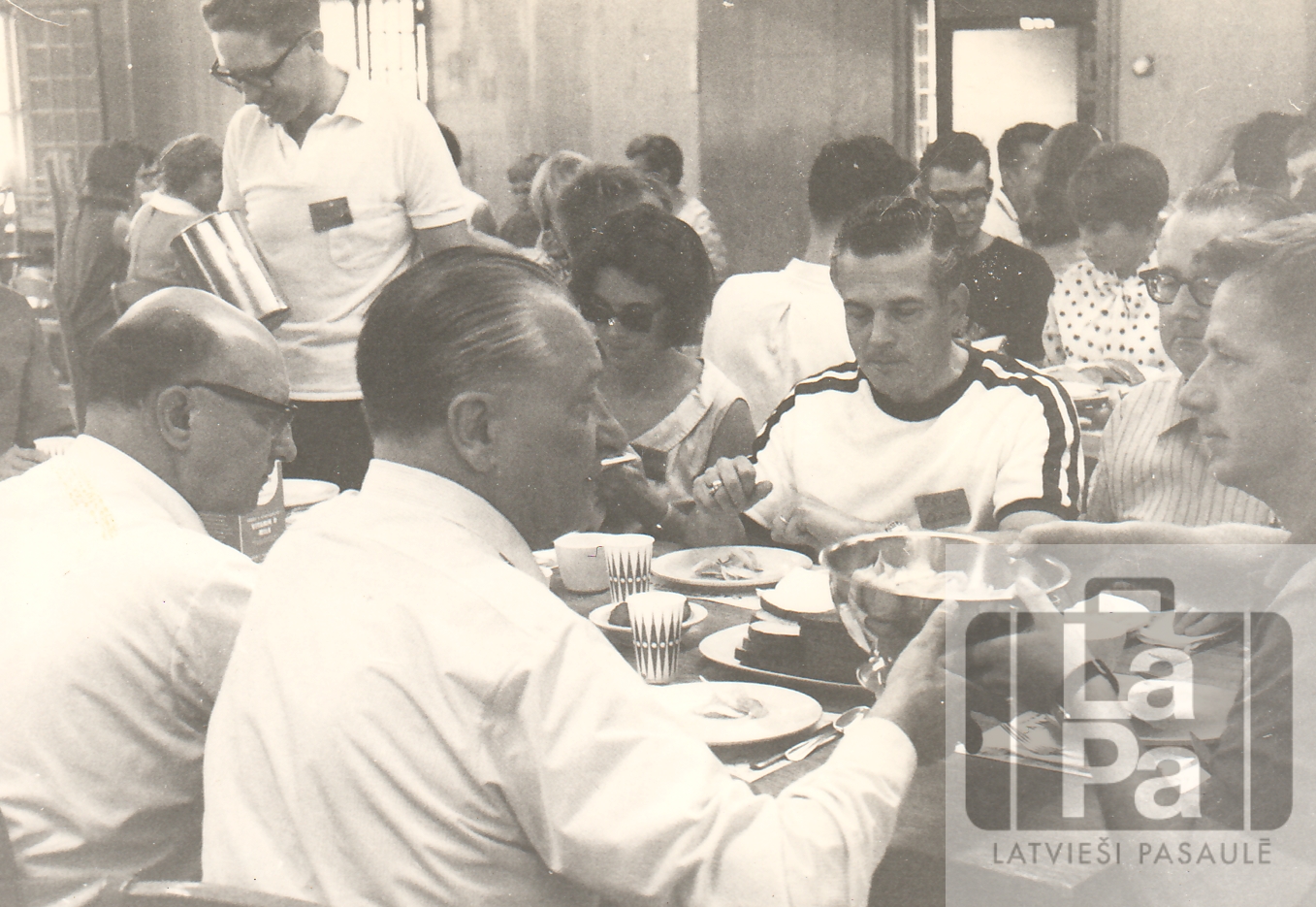 Divreizdivi nometne 27.08.–04.09.1966. Camp Covell Mičiganā. Politiķi ēd no vienas bļodas. No kreisās: B. Albats, A. Bērziņš, stāv Aivars Staško, Solveiga Miezīte, E. Dundurs, S. Rudzītis, Uldis Kariņš.