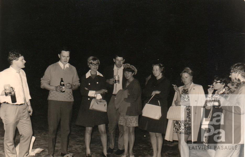 Jāņi Toštetē, Rietumvācijā 20. gadsimta 60. gados. No labās: Juris Mikulis, Ivars Vētra, Anita Grantiņa, Jānis Urdze, Laima Lange, Gita Urdze, Zenta Vētra, Maija Bērziņa, Jānis Vecvagars.