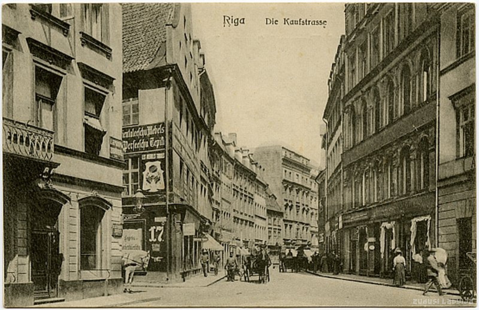 Tirgoņu ielas gals pie Krāmu ielas, attēla kreisajā pusē nams Lielajā Jaunavu ielā 1. Tirgoņu iela minēta kopš 14. gadsimta 30. gadiem (platea mercatorum, vēlāk de kopstrate, Kaufstrasse). Jau viduslaikos tā bijusi nozīmīga tirdzniecības iela. Tās nozīme īpaši pieauga pēc pilsētas tirgus pārcelšanas uz jauno Tirgus laukumu - vēlāko Rātslaukumu, kad Tirgoņu iela, kā Lielās Smilšu ielas turpinājums (Tirgoņu iela tolaik iekļāva arī Šķūņu ielas posmu līdz Zirgu ielai), savienoja tirgu ar galveno ieeju pilsētā