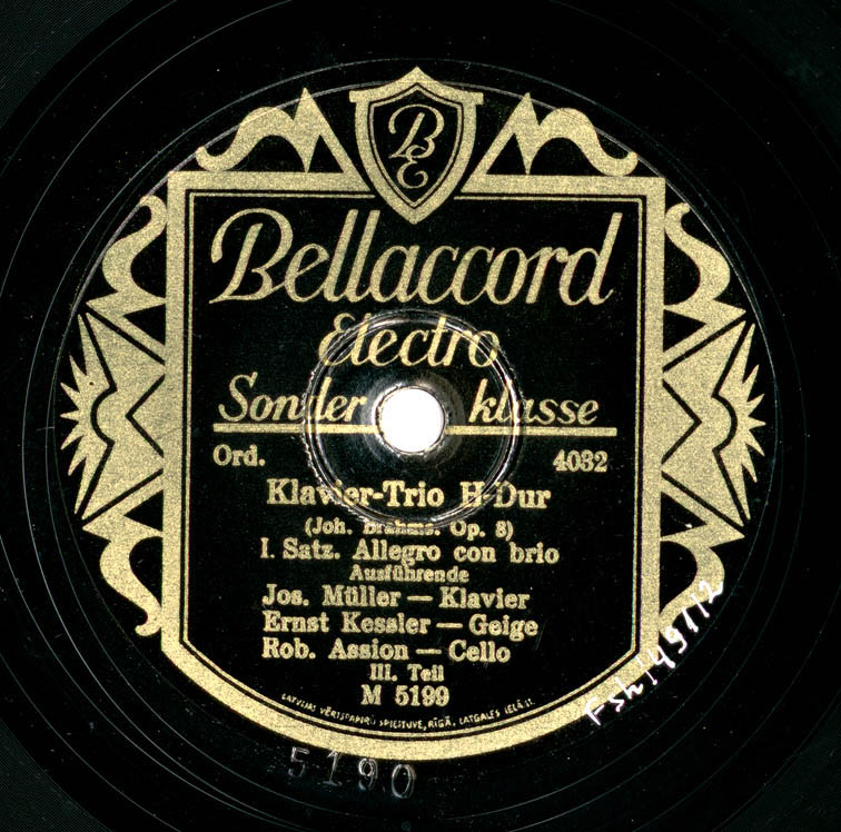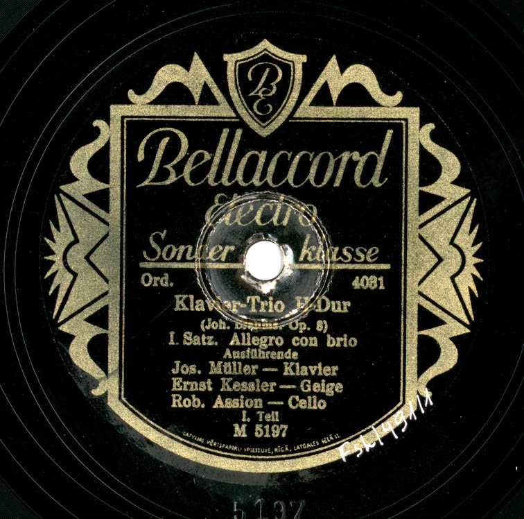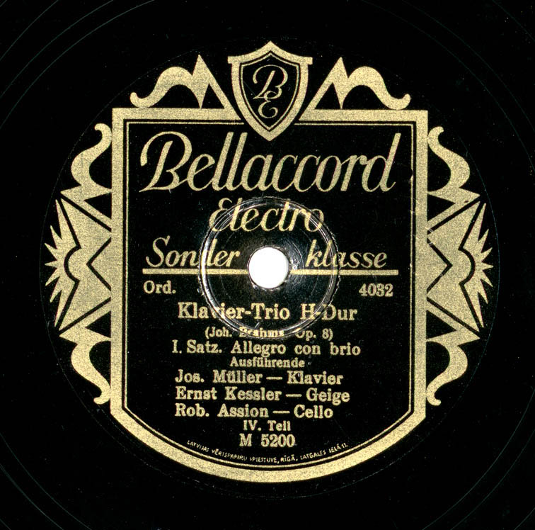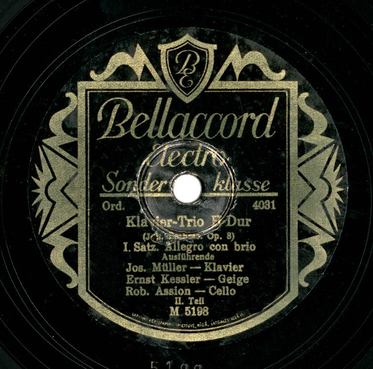 Izpildītāji: Jos. Müller - Klavier ; Ernst Kessler - Geige ; Rob. Assion - Cello