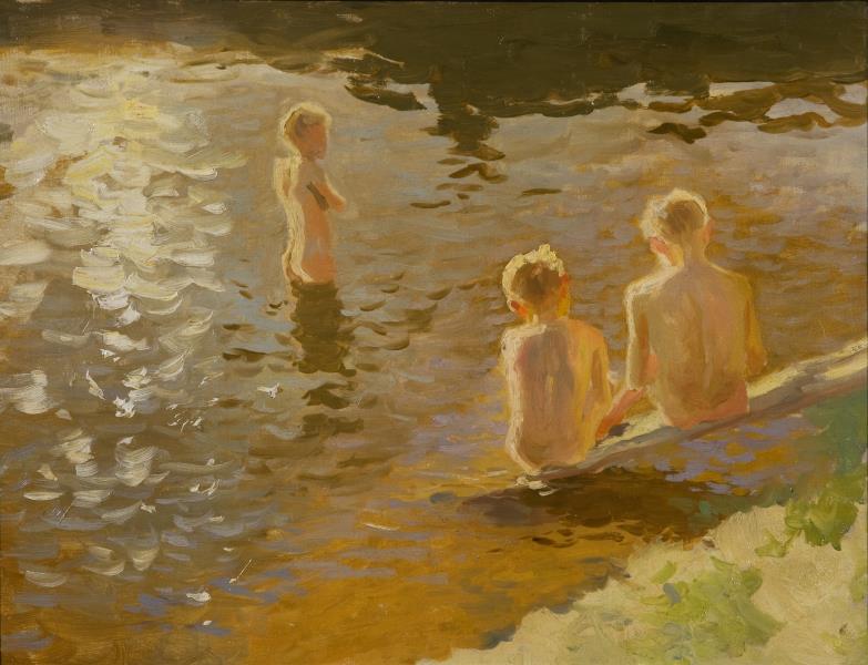 Turning to the themes of childhood and early adolescence as reflections of the spring of life and interest in the biological growing processes in both man and nature was a characteristic tendency in art at the end of the 19th and beginning of the 20th century. The impressionistic approach to the depiction of light and atmosphere in Johans Valters’ study “Bathing Boys” demonstrates an intuitively used combination of the current stylistic tendencies of the age. The artist has transformed and everyday subject – three boys swimming – into a poetic experience in which sun, water and man have merged into a single whole.