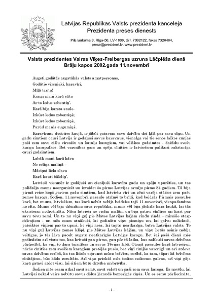 Valsts prezidentes Vairas Vīķes-Freibergas uzruna Lāčplēša dienā Brāļu kapos 2002.gada 11.novembrī