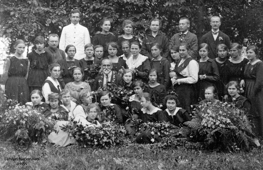 Dzejnieks, dramaturgs, sabiedriskais darbinieks Rainis kopā ar Valmieras sieviešu ģimnāzijas pēdējās klases audzēknēm un skolotājiem. Pēdējā rindā no kreisās skolotāji: 1. Kārlis Kārkliņš, 2. Purmalis, 3. Berta Stakle, 4. Alise Rulle, 6. Arvīds Brastiņš, 7. Kārlis Jansons.