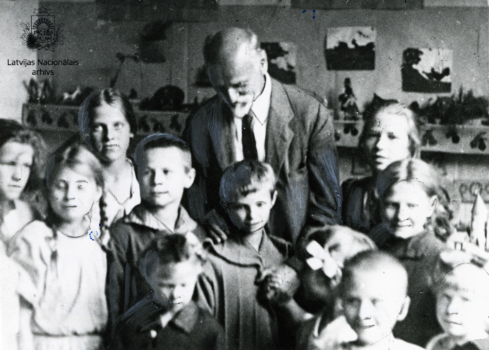 Dzejnieks, dramaturgs, sabiedriskais darbinieks Rainis ar Bulduru bērnu nama bērniem.