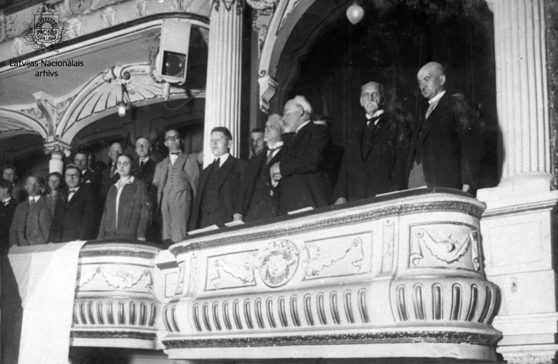 Rainis (2. no labās), Latvijas Valsts prezidents Gustavs Zemgals (3. no labās), Pauls Kalniņš (4. no labās), Ansis Rudevics (no kreisās) pasākumā Nacionālajā teātrī Rīgā.