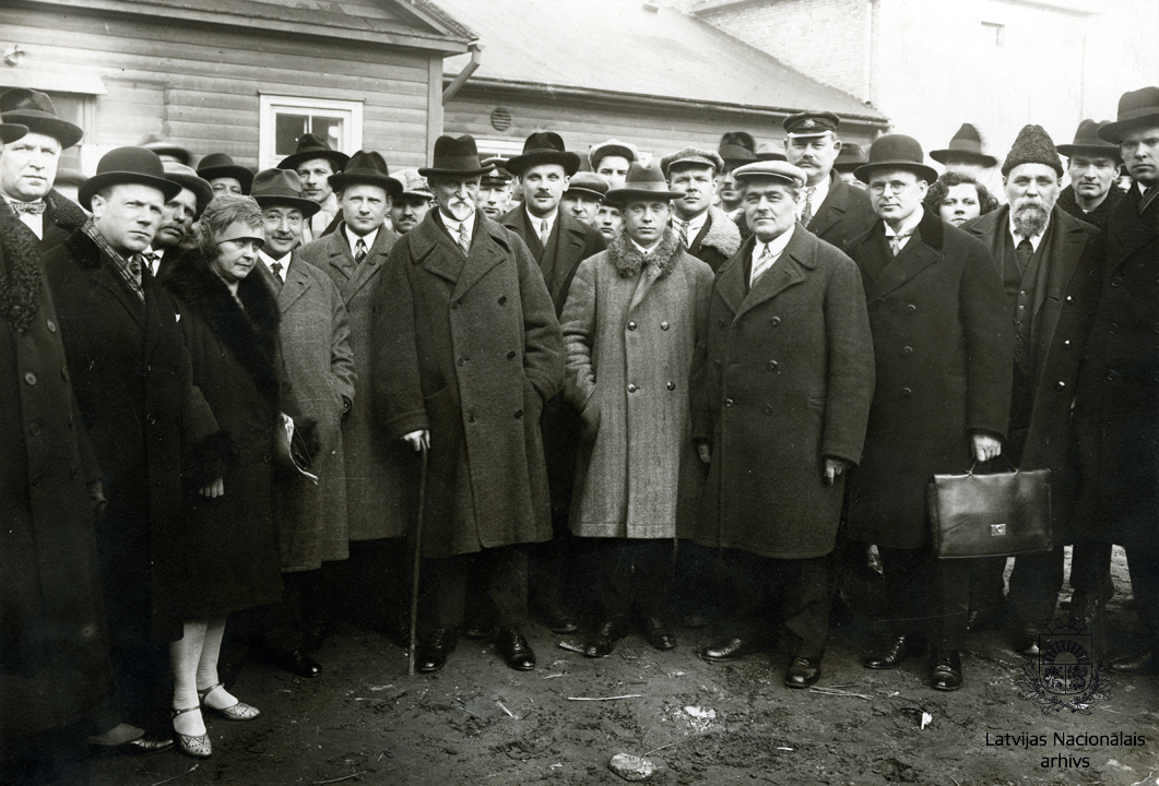 Rainis LSDSP biedru vidū. Grupas vidū Rainis, uz labo pusi no Raiņa: Ernests Voldemārs Bastjānis, Andrejs Veckalns, Fēlikss Cielēns.