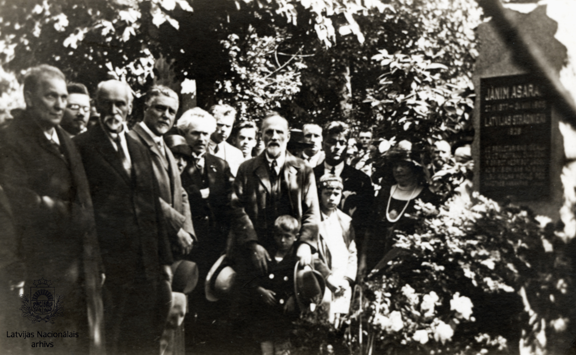 LSDSP vadošo pārstāvju grupa rakstnieka, lieteratūrkritiķa, sabiedriskā darbinieka Jāņa Asara pieminekļa atklāšanā Rīgā Lielajos kapos. Pārstāvju vidū Pauls Kalniņš, Kārlis Dēķens, Andrejs Veckalns, Kārlis Dziļleja, Rainis, Aspazija.
