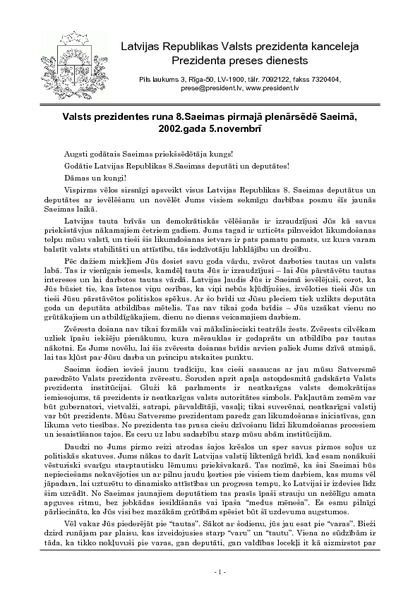 Valsts prezidentes runa 8.Saeimas pirmajā plenārsēdē Saeimā, 2002.gada 5.novembrī