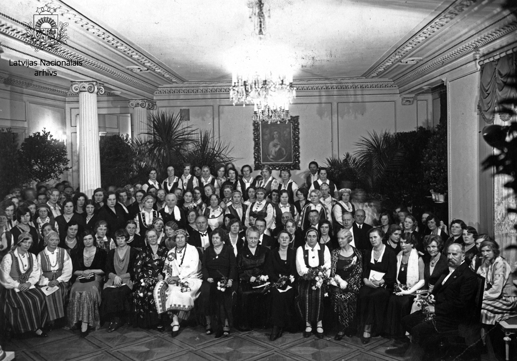 Svinīgs pasākums (iespējams, biedrības "Latvju sieviešu nacionālā līga") Rīgā. 1. rindā no kreisās: 6. Anna Brigadere, 7. Aspazija, 9. Emīlija Benjamiņa.