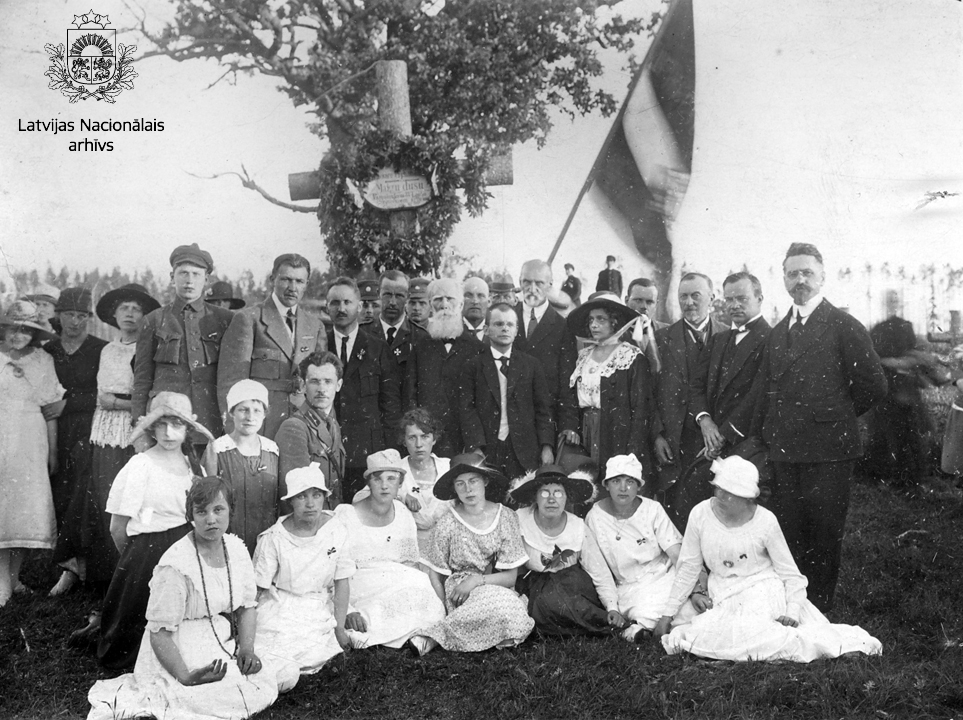 Piemiņas brīdis pie 8. Valmieras latviešu strēlnieku pulka kritušo karavīru kapsētas "Silenieki" Ložmetējkalnā. Dalībnieku vidū: Krišjānis Barons, Rainis.