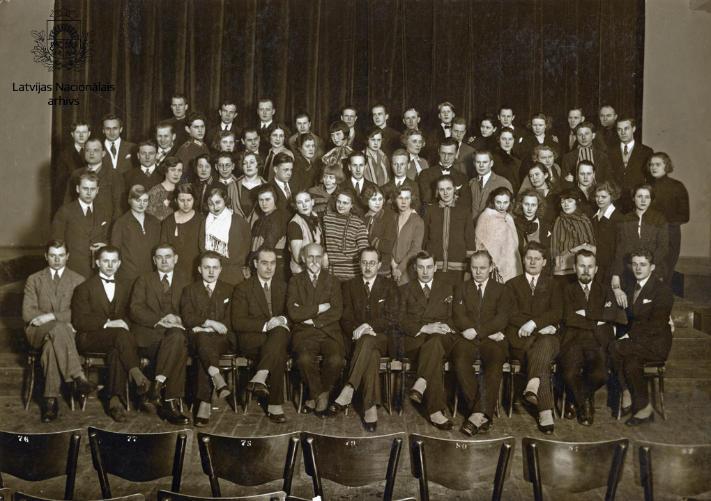 Rīgas Strādnieku teātra aktieru un vadītāju grupa. 1. rindā no kreisās: 5. aktieris un režisors Jurijs Jurovskis, 6. padomes goda priekšsēdētājs Rainis, 7. teātra direktors Roberts Dukurs, 9. dekorators Herberts Līkums.