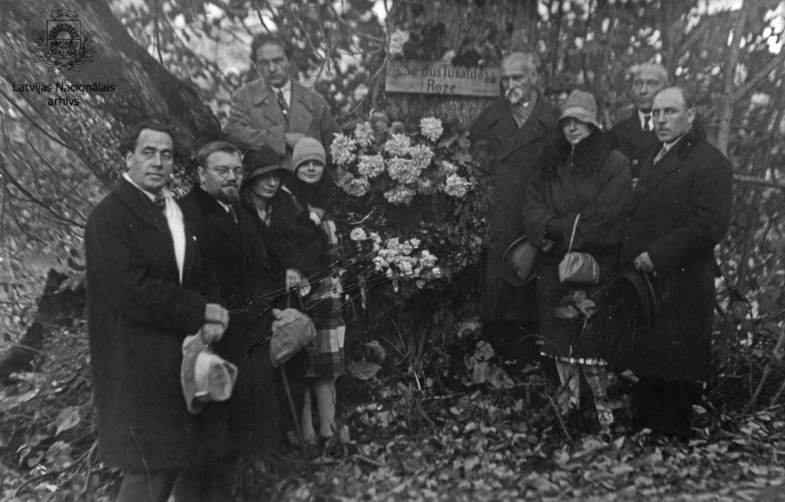 Rainis ar kultūras darbiniekiem pie Turaidas Rozes kapa Siguldā. No kreisās: Eduards Smiļģis, Kārlis Dziļleja, Felicita Ertnere, Teodors Lācis, Rainis, Emīlija Viesture.
