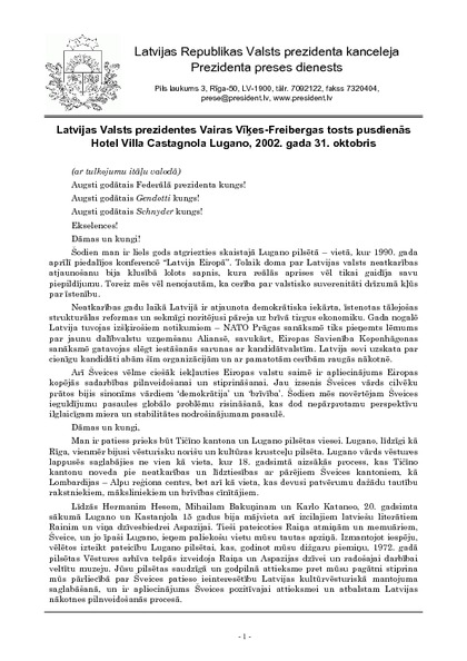 Latvijas Valsts prezidentes Vairas Vīķes-Freibergas tosts pusdienās Hotel Villa Castagnola Lugano, 2002. gada 31. oktobris