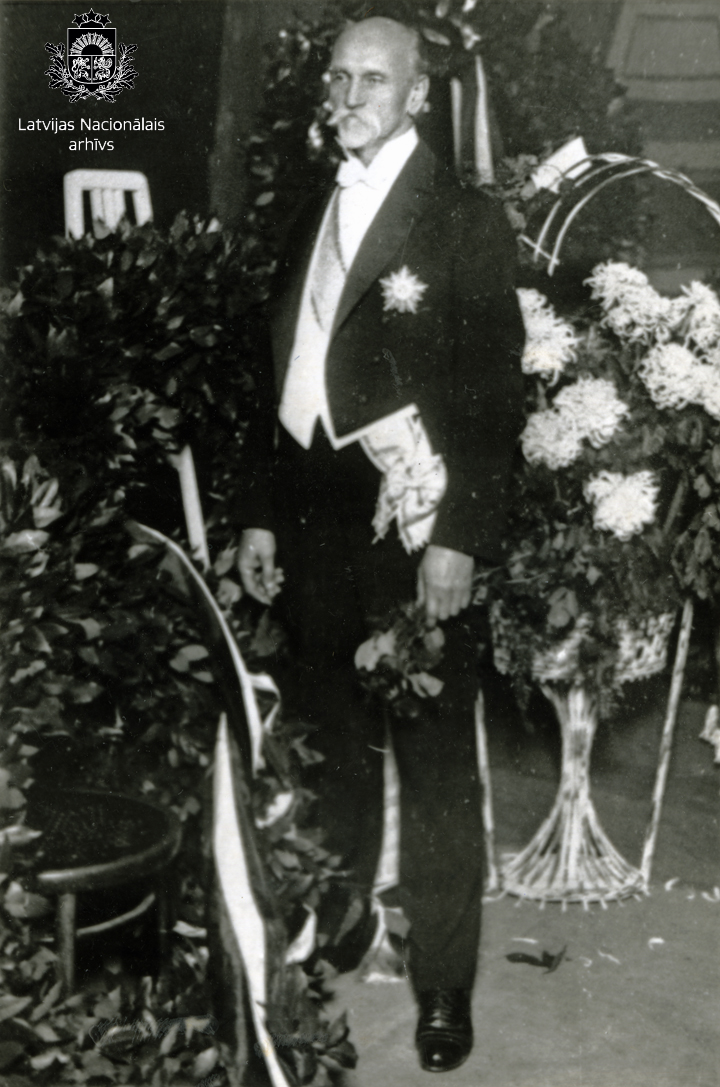 Dzejnieks, dramaturgs, sabiedriskais darbinieks Rainis 60 gadu jubilejas svinībās Nacionālajā teātrī (tērpies frakā ar Trīszvaigžņu ordeni, kuru viņam pasniedza 1925. gada 28. februārī).