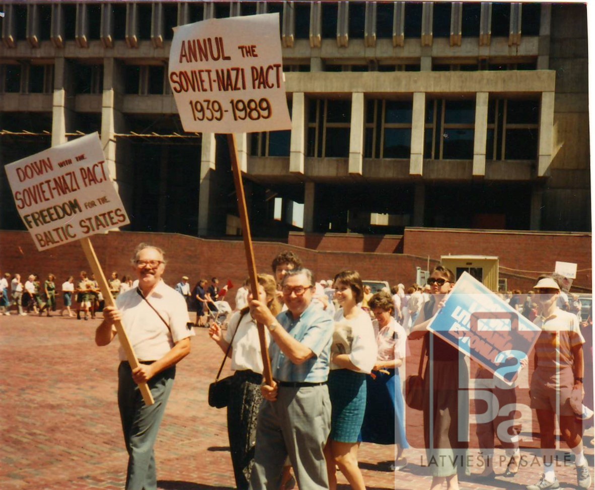 Baltiešu pretpadomju demonstrācija 50. gadadienā kopš Molotova-Ribentropa pakta pieņemšanas. 1989. gada 23. augustā Bostonā pie pilsētas valdes. Priekšā no kreisās: Vilis Treimanis, Lilija Treimane, Jānis Treimanis.